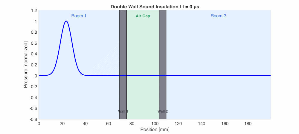 The animation below (simulated using k-Wave) shows a pressure pulse propagating through a double wall. Watch how the wave reflects multiple times at each wall, and how significantly attenuated the transmitted wave is on the other side:
