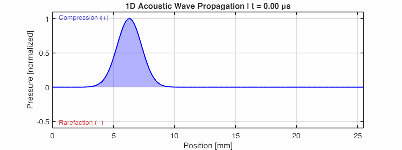The animation below (generated using k-Wave) shows this beautifully: a pressure pulse propagating outward, with the blue shading indicating regions of compression.