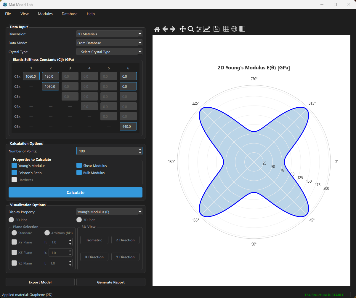 After entering elastic constants, the software automatically verifies that all eigenvalues of the stiffness matrix are positive. If the material is mechanically unstable, the interface clearly marks it as “The Structure is UNSTABLE”.