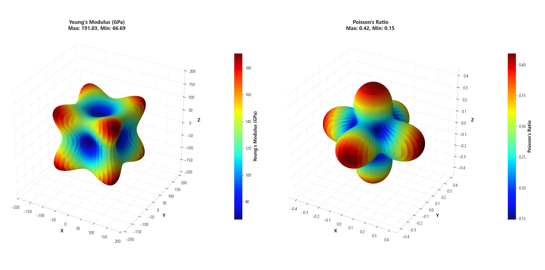 | Young’s Modulus $E(\theta, \varphi)$ | $E = 1/S’_{11}$ | 3D |