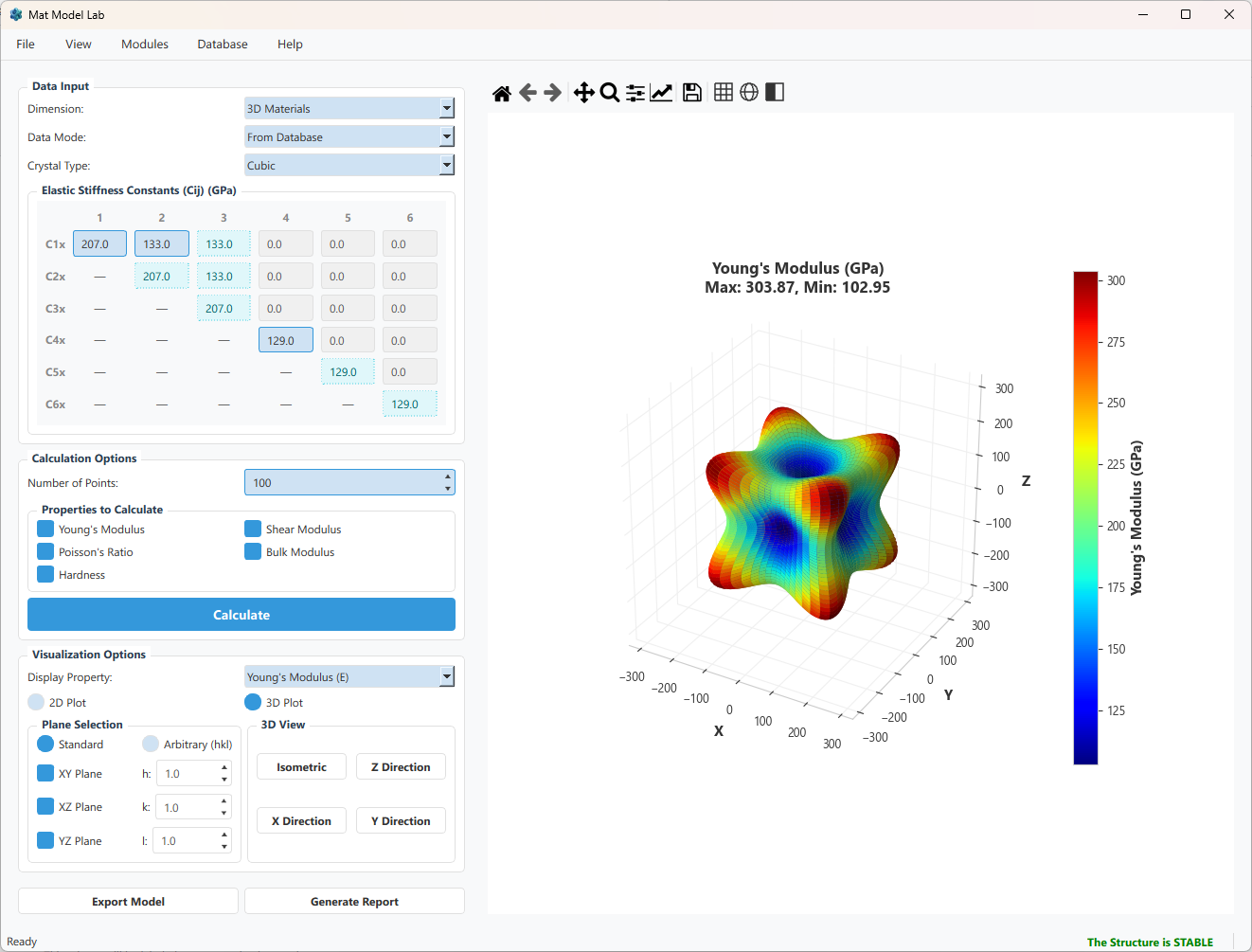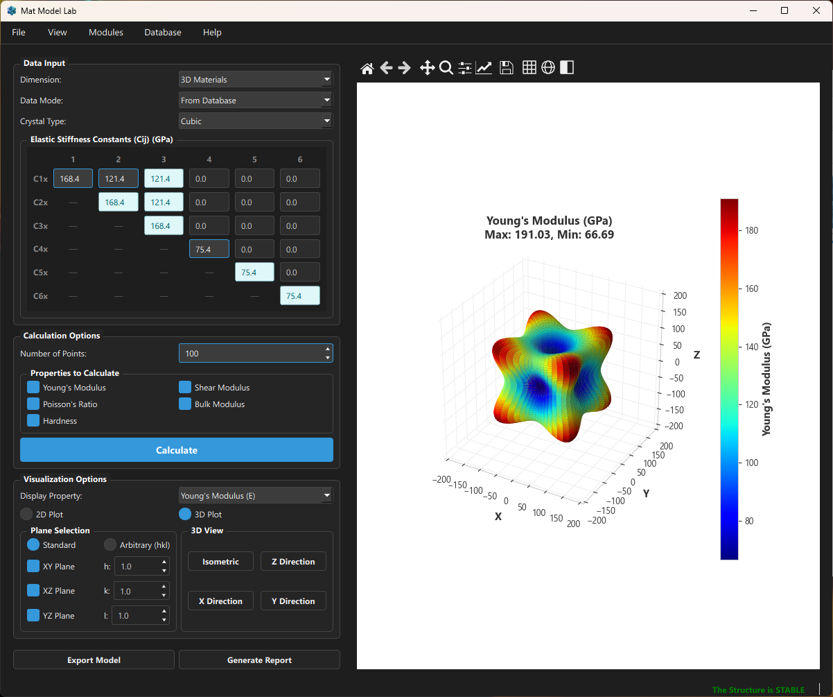 First-principles calculations or experiments hand you a $6 \times 6$ stiffness matrix — and then what? Extracting directional Young’s modulus, checking mechanical stability, computing polycrystalline averages, and exporting material cards for ABAQUS or COMSOL usually means writing one-off scripts every time. Mat Model Lab packages all of that into a single, open-source desktop application so you can go from raw $C_{ij}$ to publication-ready 3D anisotropy plots in seconds.