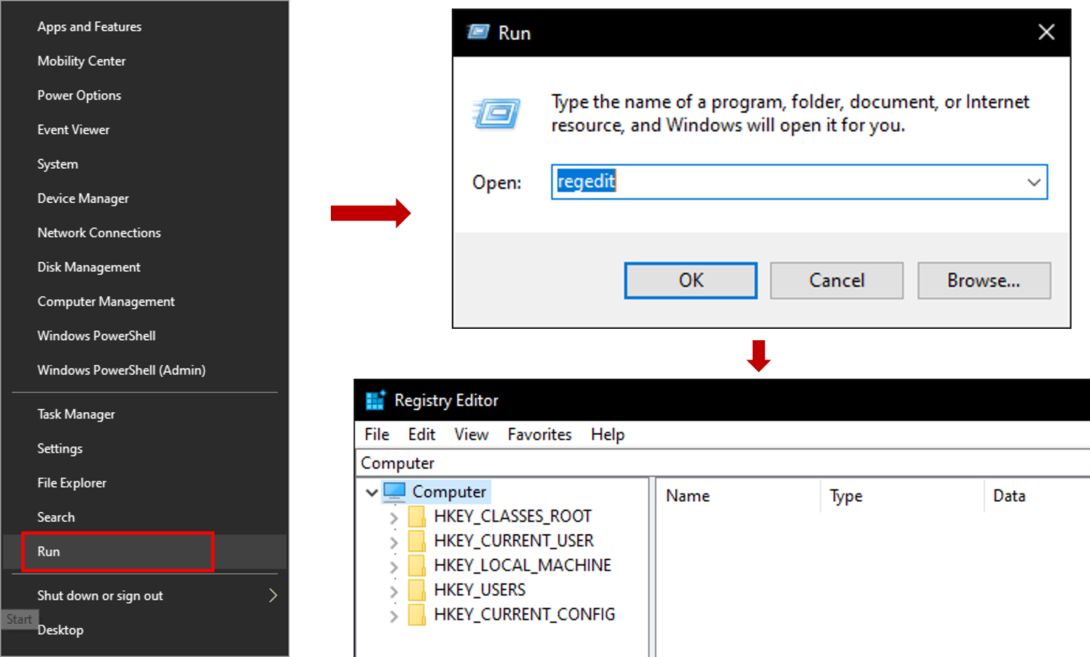 regeditinto the Open text field and select OK to launch the Registry Editor.