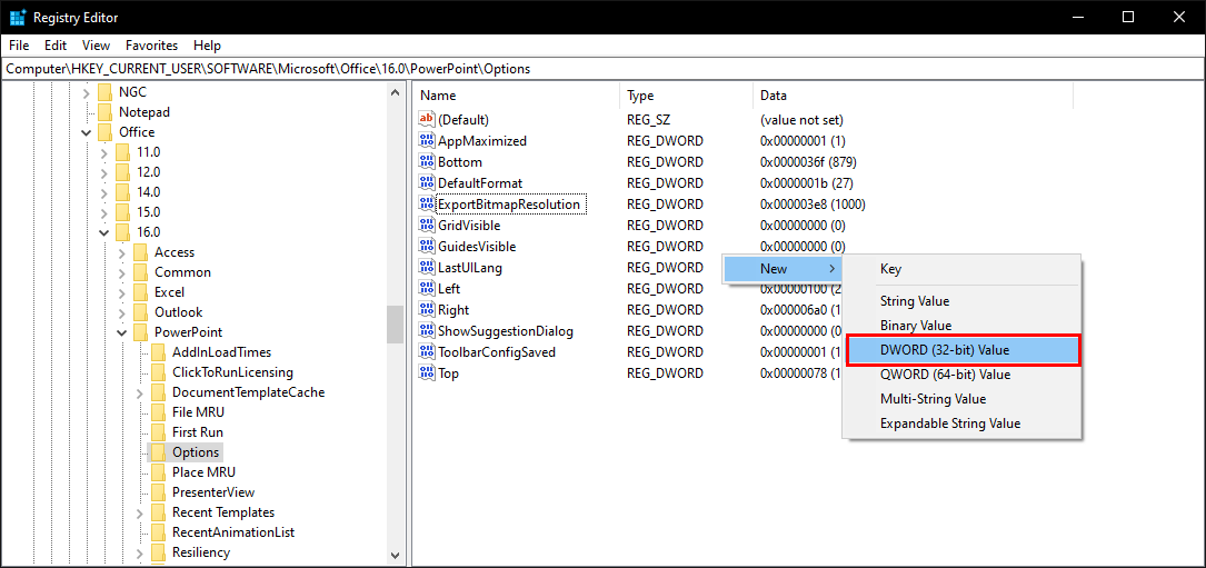 Create a new value named ExportBitmapResolution by typing the name and pressing Enter.